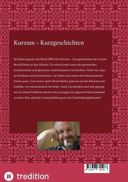 Sie schauen gerade den sehnlichst erwarteten Band DREI der Kurzum - Kurzgeschichten des Autors Bernd Kleber. Zu Recht wächst seine Fangemeinde immer weiter zu einem großen Genießerkreis an. Er erfreut seine Leser mit spannenden, einfallsreichen und gleichsam unterhaltsamen Geschichten. Nicht nur, dass sie berühren und beeindrucken, sie halten auch meist eine überraschende Pointe parat. Und immer spielt Bernd Kleber gekonnt auf der Klaviatur der Gefühle von melancholisch bis heiter. Seine Erzählungen umfassen ein breites Spektrum an Unterhaltung, auch oft mit sozialkritischen Aspekten oder dem Zeitgeist kritisch ins Leben gelauscht. Machen Sie sich gefasst auf eine Achterbahn der Gefühle mit Suchtpotential. Seine Geschichten sind sehr gefragt, seit sie einem Publikum durch seine Lesungen im eigenen Podcast bekannt wurden. Eine absolute Leseempfehlung aus der Unterhaltungsliteratur!
