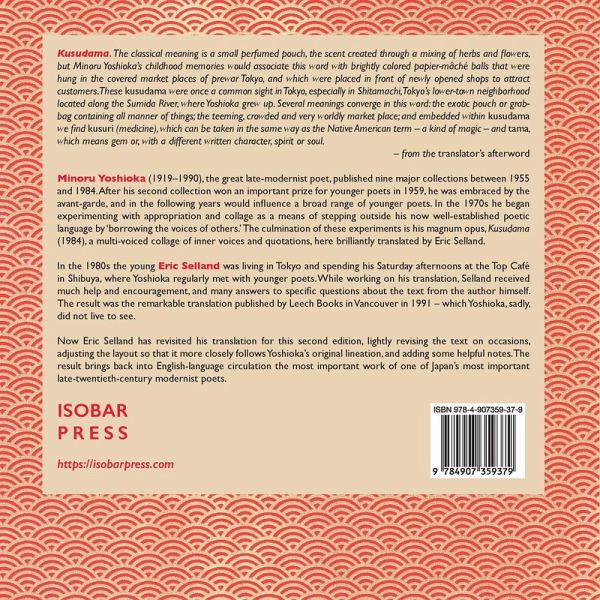 "Kusudama. The classical meaning is a small perfumed pouch, the scent created through a mixing of herbs and flowers, but Yoshioka's childhood memories would associate this word with brightly colored papier-mâché balls that were hung in the covered market places of prewar Tokyo, and which were placed in front of newly opened shops to attract customers. These kusudama were once a common sight in Tokyo, especially in Shitamachi, Tokyo's lower-town neighborhood located along the Sumida River, where Yoshioka grew up. Several meanings converge in this word: the exotic pouch or grab-bag containing all manner of things; the teeming, crowded and very worldly market place; and embedded within kusudama we find kusuri (medicine), which can be taken in the same way as the Native American term - a kind of magic - and tama, which means gem or, with a different written character, spirit or soul." (From the translator's afterword.) Minoru Yoshioka (1919-1990), the great late-modernist poet, published nine major collections between 1955 and 1984. After his second collection, Monks, won an important prize for younger poets in 1959, he was embraced by the avant-garde, and in the following years would influence a broad range of younger poets, including Kazuko Shiraishi and Takashi Hiraide. In the 1970s he began experimenting with appropriation and collage as a means of stepping outside his now well-established poetic language by 'borrowing the voices of others.' The culmination of these experiments is his magnum opus, Kusudama (1984), a multi-voiced collage of inner voices and quotations, here brilliantly translated by Eric Selland. In the 1980s the young Eric Selland was living in Tokyo and spending his Saturday afternoons at the Top Café in Shibuya, where Yoshioka regularly met with younger poets. While working on his translation of Kusudama Selland received much help and encouragement, and many answers to specific questions about the text from the author himself. The result was the remarkable translation of Kusudama published by Leech Books in Vancouver in 1991 - which Yoshioka, sadly, did not live to see. Now Eric Selland has revisited his translation for this second edition, lightly revising the text on occasions, adjusting the layout so that it more closely follows Yoshioka's original lineation, and adding some helpful notes. The result brings back into English-language circulation the most important work of one of Japan's most important late-twentieth-century modernist poets.