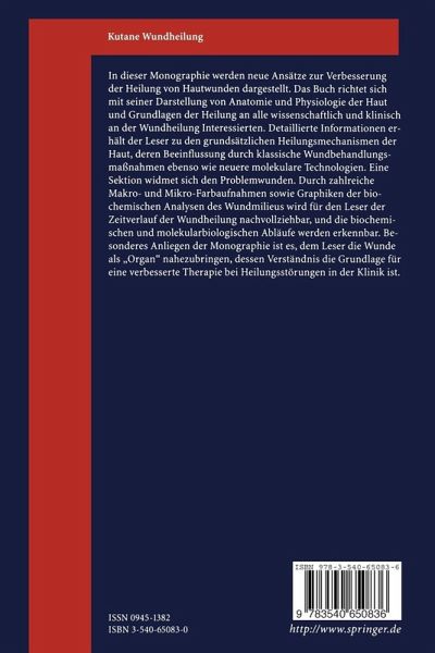 In dieser Monographie werden neue Ansätze zur Verbesserung der Heilung von Hautwunden dargestellt. Das Buch richtet sich mit seiner Darstellung von Anatomie und Physiologie der Haut und Grundlagen der Heilung an alle wissenschaftlich und klinisch an der Wundheilung Interessierten. Detaillierte Informationen erhält der Leser zu den grundsätzlichen Heilungsmechanismen der Haut, deren Beeinflussung durch klassische Wundbehandlungsmaßnahmen ebenso wie neuere molekulare Technologien. Eine Sektion widmet sich den Problemwunden. Durch zahlreiche Makro- und Mikro-Farbaufnahmen sowie Graphiken der biochemischen Analysen des Wundmilieus wird für den Leser der Zeitverlauf der Wundheilung nachvollziehbar und die biochemischen und molekularbiologischen Abläufe erkennbar. Besonderes Anliegen der Monographie ist es, dem Leser die Wunde als "Organ" nahe zubringen, dessen Verständnis die Grundlage für eine verbesserte Therapie bei Heilungsstörungen in der Klinik ist.
