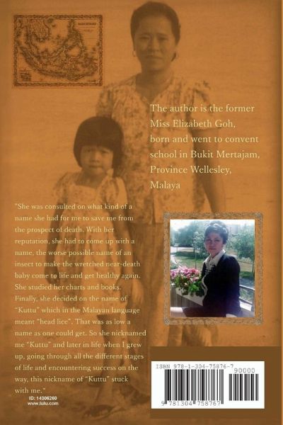 An inspirational memoir of Elizabeth "Kuttu" Goh Sharman, from rural Malaya. Given away at birth by her biological parents, she is raised by a saintly aunt, Heok Ee. At birth, she was given the nickname "Kuttu", by her great aunt, the word meaning head lice. The relative explained the name would strengthen her to overcome her weak health and poor prospects. The effect seems to work perhaps leading Elizabeth to great success on a larger stage, however possibly at the cost of an inferiority complex that with the name sticks with her all her life. Initially a poor student, several "guardian angels" come along to encourage her to believe in herself, work hard and persevere. She eventually excels at business school and qualifies for a top job with a UN branch in Kuala Lumpur then in Geneva. In Geneva she marries a renowned international labor organizer, an Englishman. She starts a family and travels the world with her new husband before settling down in the US as her American dream comes true.