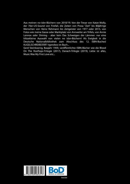 Aus meinen no-isbn-Büchern von 2018/19. Von der Treue von Katze Molly, der 70er-US-Sound von Firefall, die Zeiten von Prosa "Zeit" bis 80jährige Menschen von Heinz Rühmann bis Zeitgeister von 1977 oder 2015, von Fotos wie meine Gasse oder Marktplatz von Annweiler am Trifels, von Annie Lennox oder Shining - aber kein Das Schweigen der Lämmer: nur eine klitzekleine Auswahl von vielen no isbn-Büchern! Als Ewigkeit in die Deutsche Nationalbibliothek zum Abschluss des 12. ISBN-Buches! KUGELSCHREIBEÄÄR? Irgendwo im Buch...Gerd Steinkoenig, Baujahr 1959, veröffentlichte ISBN-Bücher wie die Blood On The Rooftops-Trilogie (2017), Danach-Trilogie (2019), Liebe ist alles, Music Was My First Love etc...