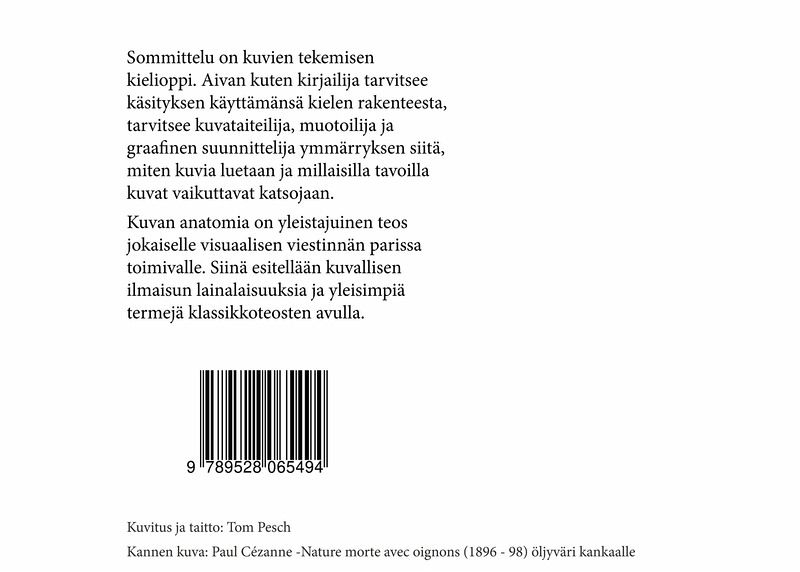 Sommittelu on kuvien tekemisen kielioppi. Aivan kuten kirjailija tarvitsee käsityksen käyttämänsä kielen rakenteesta, tarvitsee kuvataiteilija, valokuvaaja ja graafikko ymmärryksen siitä, miten kuvia luetaan ja millaisilla tavoilla kuvat vaikuttavat katsojiin. Kuvan anatomia on yleistajuinen teos jokaiselle visuaalisen viestinnän parissa toimivalle. Siinä esitellään kuvallisen ilmaisun lainalaisuuksia ja yleisimpiä termejä klassikkoteosten avulla.