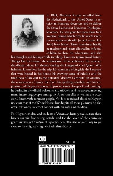 In 1898, Abraham Kuyper (1837-1920) travelled from the Netherlands to the United States to deliver the Stone Lectures at Princeton Theological Seminary. He was gone for more than four months; during which time he wrote twenty-two letters to his wife Jo (and seven children) back home. These sometimes hastily penned personal letters allowed his wife and children to share his adventures, and also his thoughts and feelings while traveling. These are typical travel letters. For Kuyper scholars and students of American history and culture these letters contain fascinating details, and for the lover of the epistolary genre and the petit histoire this publication offers the opportunity to get close to the enigmatic figure of Abraham Kuyper.