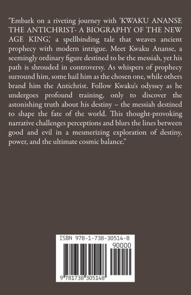 "Embark on a riveting journey with 'KWAKU ANANSE THE ANTICHRIST- A BIOGRAPHY OF THE NEW AGE KING,' a spellbinding tale that weaves ancient prophecy with modern intrigue. Meet Kwaku Ananse, a seemingly ordinary figure destined to be the messiah, yet his path is shrouded in controversy. As whispers of prophecy surround him, some hail him as the chosen one, while others brand him the Antichrist. Follow Kwaku's odyssey as he undergoes profound training, only to discover the astonishing truth about his destiny - the messiah destined to shape the fate of the world. This thought-provoking narrative challenges perceptions and blurs the lines between good and evil in a mesmerizing exploration of destiny, power, and the ultimate cosmic balance."