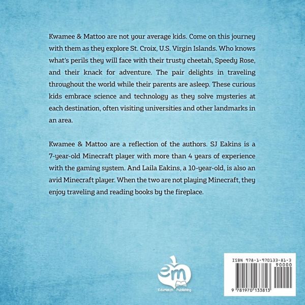 Kwamee & Mattoo are not your average kids. Come on this journey with them as they explore St. Croix, U.S. Virgin Islands. Who knows what's perils they will face with their trusty cheetah, Speedy Rose, and their knack for adventure. The pair delights in traveling throughout the world while their parents are asleep. These curious kids embrace science and technology as they solve mysteries at each destination, often visiting universities and other landmarks in an area. Kwamee & Mattoo are a reflection of the authors. SJ Eakins is a 7-year-old Minecraft player with more than 4 years of experience with the gaming system. And Laila Eakins, a 10-year-old, is also an avid Minecraft player. When the two are not playing Minecraft, they enjoy traveling and reading books by the fireplace.