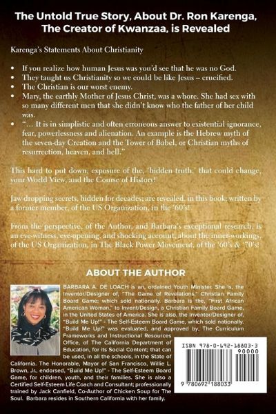 The Untold True Story, About Dr. Ron Karenga, The Creator of Kwanzaa, is Revealed This hard to put down, exposure of the "hidden truth; that could change, your Worldview and the Course of History! Jaw dropping secrets, hidden for decades; are revealed, in this book; written by a former member, of the US Organization, in the '60's! From the perspective, of the Author, and Barbara's exceptional research is an eye-witness, eye-opening, and shocking account, about the inner-workings, of the US Organization, in The Black Power Movement, of the '60's & the 70's!
