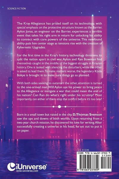 The Kray Allegiance has prided itself on its technology, with special emphasis on the protective structure known as the Barrier. Aylon Jonas, an engineer on the Barrier, experiences a terrible event that takes his right arm in return for unlocking his ability to connect with core powers of the universe. This newfound ability puts him center stage as tensions rise with the creation of Kybernetic Upgrades. For the first time in the Kray's history, technology threatens to split the nation apart in civil war. Aylon and Ran Bowman find themselves caught in the middle of the biggest struggle in Krayian history. One is tasked with silencing the disturbers, while the other is asked to lead them. To make matters worse, the legendary Klyde Bokye is brought in to make sure things go as planned. With both sides seeking to outsmart the other, attention is turned to the one-armed man. Will Aylon use his power to bring peace to the Allegiance or instigate a war that could mean the end of his nation? Can Ran do what's right under his scrutiny? Most importantly, can either of them stop the conflict before it's too late?