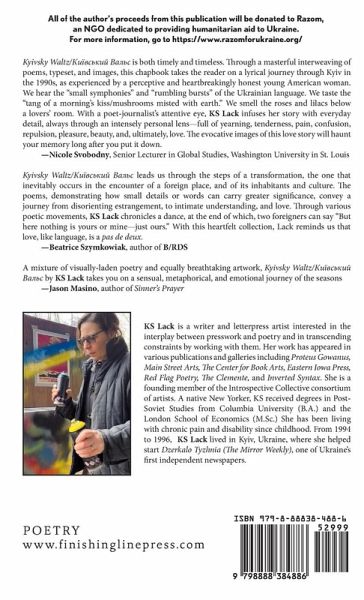 KS started writing Kyivsky Waltz in 2014, at the start of Ukraine's Revolution of Dignity (a.k.a. the Maidan Revolution), to answer the question she was asked more and more as the invasion grew into the monstrosity it has become: why did she love Ukraine so much? Kyivsky Waltz is a hybrid chapbook that uses poetry and artwork to tell the story of how KS experienced Ukraine from 1994 to 1996: arriving at 22, alone, completely lost and unable to communicate, yet somehow managing to find a home and people to love in a new nation with an old history. All of the author's proceeds will be donated to Razom, a nonprofit organization committed to raising funds for Ukrainian humanitarian aid.