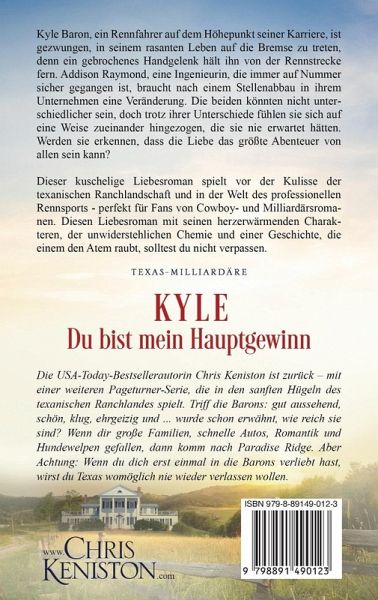 Kyle Baron, ein Rennfahrer auf dem Höhepunkt seiner Karriere, ist gezwungen, in seinem rasanten Leben auf die Bremse zu treten, denn ein gebrochenes Handgelenk hält ihn von der Rennstrecke fern. Addison Raymond, eine Ingenieurin, die immer auf Nummer sicher gegangen ist, braucht nach einem Stellenabbau in ihrem Unternehmen eine Veränderung. Die beiden könnten nicht unterschiedlicher sein, doch trotz ihrer Unterschiede fühlen sie sich auf eine Weise zueinander hingezogen, die sie nie erwartet hätten. Werden sie erkennen, dass die Liebe das größte Abenteuer von allen sein kann? Dieser kuschelige Liebesroman spielt vor der Kulisse der texanischen Ranchlandschaft und in der Welt des professionellen Rennsports - perfekt für Fans von Cowboy- und Milliardärsromanen. Diesen Liebesroman mit seinen herzerwärmenden Charakteren, der unwiderstehlichen Chemie und einer Geschichte, die einem den Atem raubt, solltest du nicht verpassen. Die USA-Today-Bestsellerautorin Chris Keniston ist zurück - mit einer weiteren Pageturner-Serie, die in den sanften Hügeln des texanischen Ranchlandes spielt. Triff die Barons: gut aussehend, schön, klug, ehrgeizig und ... wurde schon erwähnt, wie reich sie sind? Wenn dir große Familien, schnelle Autos, Romantik und Hundewelpen gefallen, dann komm nach Paradise Ridge. Aber Achtung: Wenn du dich erst einmal in die Barons verliebt hast, wirst du Texas womöglich nie wieder verlassen wollen. Weitere Bücher der Texas-Milliardäre Reihe: 1. Chase: Du bist mein Glück 2. Kyle: Du bist mein Hauptgewinn 3. Jared: Du bist meine Hoffnung 4. Craig: Du bist mein Star 5. Daniel: Du bist mein Traum 6. Jack: Du bist mein Ein und Alles 7. Mitch: Du bist meine zweite Chance