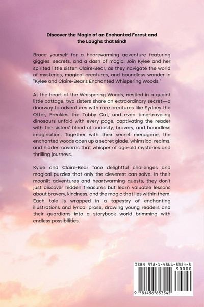 Discover the Magic of an Enchanted Forest and the Laughs that Bind! Attention: Brace yourself for a heartwarming adventure featuring giggles, secrets, and a dash of magic! Join Kylee and her spirited little sister, Claire-Bear, as they navigate the world of mysteries, magical creatures, and boundless wonder in "Kylee and Claire-Bear's Enchanted Whispering Woods." Interest: At the heart of the Whispering Woods, nestled in a quaint little cottage, two sisters share an extraordinary secret-a doorway to a world where raccoons strum oak-made lutes and squirrels tap upon hollow log drums. Their days, filled with the companionship of wise old owls, whimsical cats, and moonbeam-loving otters, transform into unforgettable adventures in lands where anything becomes possible. From uncovering the hidden melodies of their forest friends to moonlit flights and starlit tea parties on the moon, each escapade is a new chapter filled with magic and discovery. Adventures with rare enigmatic creatures like Sydney the Otter, Freckles the Tabby Cat, and even time-traveling dinosaurs unfold with every page, captivating the reader with the sisters' blend of curiosity, bravery, and boundless imagination. Together with their secret menagerie, the enchanted woods open up a secret glade, whimsical realms, and hidden caverns that whisper of age-old mysteries and thrilling journeys. Desire: Kylee and Claire-Bear face delightful challenges and magical puzzles that only the cleverest can solve. In their moonlit adventures and heartwarming quests, they don't just discover hidden treasures but learn valuable lessons about bravery, kindness, and the magic that lies within them. Each tale is wrapped in a tapestry of enchanting illustrations and lyrical prose, drawing young readers and their guardians into a storybook world brimming with endless possibilities. Action: Don't miss out on these spellbinding escapades that will make you laugh, gasp, and, most importantly, believe in magic. Perfect for young readers and the young-at-heart, "Kylee and Claire-Bear's Enchanted Whispering Woods" is not just a book-it's a journey into a world where every leaf whispers a secret and each sunrise promises a new adventure. Grab your copy now and step into the enchantment!