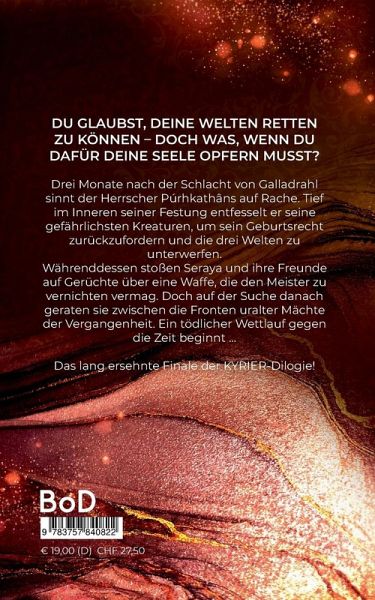Du glaubst, deine Welten retten zu können - doch was, wenn du dafür deine Seele opfern musst?Drei Monate nach der Schlacht von Galladrahl sinnt der Herrscher Púrhkathâns auf Rache. Tief im Inneren seiner Festung entfesselt er seine gefährlichsten Kreaturen, um sein Geburtsrecht zurückzufordern und die drei Welten zu unterwerfen.Währenddessen stoßen Seraya und ihre Freunde auf Gerüchte über eine Waffe, die den Meister zu vernichten vermag. Doch auf der Suche danach geraten sie zwischen die Fronten uralter Mächte der Vergangenheit. Ein tödlicher Wettlauf gegen die Zeit beginnt ...Das lang ersehnte Finale der KYRIER-Dilogie!
