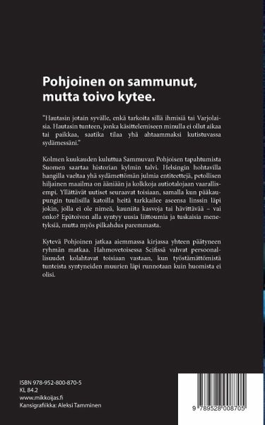 Kolmen kuukauden kuluttua Sammuvan Pohjoisen tapahtumista Suomen saartaa historian kylmin talvi. Helsingin hohtavilla hangilla vaeltaa yhä sydämettömän julmia entiteettejä, petollisen hiljainen maailma on ääniään ja kolkkoja autiotalojaan vaarallisempi. Yllättävät uutiset seuraavat toisiaan, samalla kun pääkaupungin tuulisilla katoilla heitä tarkkailee aseensa linssin läpi jokin, jolla ei ole nimeä, kauniita kasvoja tai hävittävää. Vai onko? Epätoivon alla syntyy uusia liittoumia ja tuskaisia menetyksiä, mutta myös pilkahdus paremmasta. Kytevä Pohjoinen jatkaa aiemmassa kirjassa yhteen päätyneen ryhmän matkaa. Hahmovetoisessa Scifissä vahvat persoonallisuudet kolahtavat toisiaan vastaan, kun työstämättömistä tunteista syntyneiden muurien läpi runnotaan kuin huomista ei olisi.