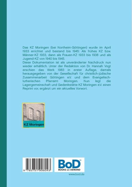 Das KZ Moringen (bei Northeim-Göttingen) wurde im April 1933 errichtet und bestand bis 1945: Als frühes KZ bzw. Männer-KZ 1933, dann als Frauen-KZ 1933 bis 1938 und als Jugend-KZ von 1940 bis 1945.Diese Dokumentation ist als unveränderter Nachdruck nun wieder erhältlich. Unter der Redaktion von Dr. Hannah Vogt erschien das Werk 1983 in erster Auflage, damals herausgegeben von der Gesellschaft für christlich-jüdische Zusammenarbeit Göttingen e.V. und dem Evangelisch-lutherischen Pfarramt Moringen. Nun legt die Lagergemeinschaft und Gedenkstätte KZ Moringen e.V. einen Reprint vor, ergänzt um ein aktuelles Vorwort.