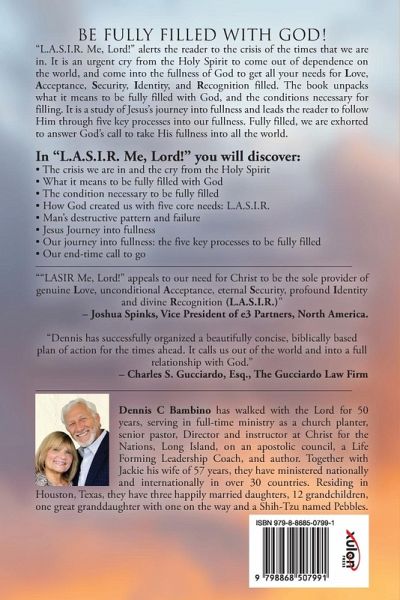 Be Fully Filled with God! "L.A.S.I.R. Me, Lord!" alerts the reader to the crisis of the times that we are in. It is an urgent cry from the Holy Spirit to come out of dependence on the world, and come into the fullness of God to get all your needs filled. The book unpacks what it means to be fully full of God, and the conditions necessary for filling. It is a study of Jesus's journey into fullness and leads the reader to follow Him through five key processes into our fullness. Fully filled, we are exhorted to answer God's call to take His fullness into all the world. In "L.A.S.I.R. Me, Lord!" you will discover: - The crisis we are in and the cry from the Holy Spirit - What it means to be fully filled with God - The condition necessary to be fully filled - How God created us with five core needs: L.A.S.I.R. - Man's destructive pattern and failure - Jesus Journey into fullness - Our journey into fullness: the five key processes to be fully filled - Our end-time call to go _________________________________________________________ ""LASIR Me, Lord!" appeals to our need for Christ to be the sole provider of genuine Love, unconditional Acceptance, eternal Security, profound Identity and divine Recognition (L.A.S.I.R.)" - Joshua Spinks, Vice President of e3 Partners, North America. "Dennis has successfully organized a beautifully concise, biblically based plan of action for the times ahead. It calls us out of the world and into a full relationship with God." - Charles S. Gucciardo, Esq., The Gucciardo Law Firm Dennis C Bambino has walked with the Lord for 50 years, serving in full-time ministry as a church planter, senior pastor, Director and instructor at Christ for the Nations, Long Island, on an apostolic council, a Life Forming Leadership Coach, and author. Together with Jackie his wife of 57 years, they have ministered nationally and internationally in over 30 countries. Residing in Houston, Texas, they have three happily married daughters, 12 grandchildren, one great granddaughter with one on the way and a Shih-Tzu named Pebbles.