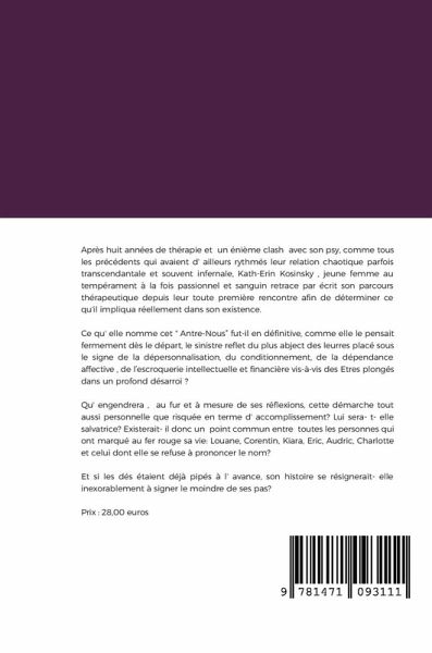 Après huit années de thérapie et un énième clash avec son psy, comme tous les précédents qui avaient d'ailleurs rythmés leur relation chaotique parfois transcendantale et souvent infernale, Kath-Erin Kosinsky , jeune femme au tempérament à la fois passionnel et sanguin retrace par écrit son parcours thérapeutique depuis leur toute première rencontre afin de déterminer ce qu'il impliqua réellement dans son existence. Ce qu'elle nomme cet " Antre-Nous" fut-il en définitive, comme elle le pensait fermement dès le départ, le sinistre reflet du plus abject des leurres placé sous le signe de la dépersonnalisation, du conditionnement, de la dépendance affective , de l'escroquerie intellectuelle et financière vis-à-vis des Êtres plongés dans un profond désarroi ? Qu'engendrera , au fur et à mesure de ses réflexions, cette démarche tout aussi personnelle que risquée en terme d'accomplissement ? Lui sera-t-elle salvatrice ? Existerait-il donc un point commun entre toutes les personnes qui ont marqué au fer rouge sa vie: Louane, Corentin, Kiara, Eric, Audric, Charlotte et celui dont elle se refuse à prononcer le nom ? Et si les dés étaient déjà pipés à l' avance, son histoire se résignerait-elle inexorablement à signer le moindre de ses pas ?
