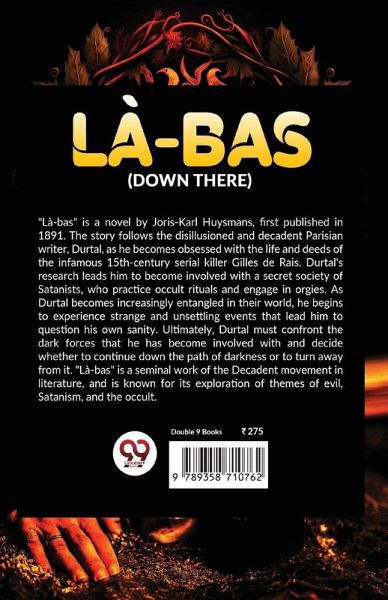 "Là-bas" is a novel by Joris-Karl Huysmans, first published in 1891. The story follows the disillusioned and decadent Parisian writer, Durtal, as he becomes obsessed with the life and deeds of the infamous 15th-century serial killer Gilles de Rais. Durtal's research leads him to become involved with a secret society of Satanists, who practice occult rituals and engage in orgies. As Durtal becomes increasingly entangled in their world, he begins to experience strange and unsettling events that lead him to question his own sanity. Ultimately, Durtal must confront the dark forces that he has become involved with and decide whether to continue down the path of darkness or to turn away from it. "Là-bas" is a seminal work of the Decadent movement in literature, and is known for its exploration of themes of evil, Satanism, and the occult.