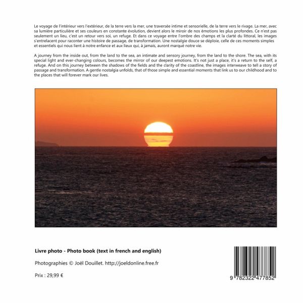 Le voyage de l'intérieur vers l'extérieur, de la terre vers la mer, une traversée intime et sensorielle, de la terre vers le rivage. La mer, avec sa lumière particulière et ses couleurs en constante évolution, devient alors le miroir de nos émotions les plus profondes. Ce n'est pas seulement un lieu, c'est un retour vers soi, un refuge. Et dans ce voyage entre l'ombre des champs et la clarté du littoral, les images s'entrelacent pour raconter une histoire de passage, de transformation. Une nostalgie douce se déploie, celle des moments simples et essentiels qui nous lient à notre enfance et aux lieux qui, à jamais, auront marqué notre vie. A journey from the inside out, from the land to the sea, an intimate and sensory journey, from the land to the shore. The sea, with its special light ans ever-changing colours, becomes the mirror of our deepest emotions. It's no just a place, it's a return to the self, a refuge. And on this journey between the shadows of the fields and the clarity of the coastline, the images interweave to tell a story of passage and transformation. A gentle nostalgia unfolds, that of those simple and essential moments that link us to our childhood and the places that will forever mark our lives.