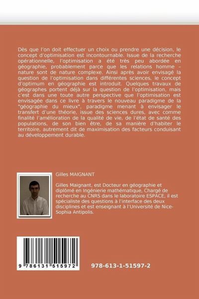 Dès que l on doit effectuer un choix ou prendre une décision, le concept d optimisation est incontournable. Issue de la recherche opérationnelle, l optimisation a été très peu abordée en géographie, probablement parce que les relations homme nature sont de nature complexe. Ainsi après avoir envisagé la question de l optimisation dans différentes sciences, le concept d optimum en géographie est introduit. Quelques travaux de géographes portent déjà sur la question de l optimisation, mais c est dans une toute autre perspective que l optimisation est envisagée dans ce livre à travers le nouveau paradigme de la "géographie du mieux", paradigme menant à envisager le transfert d une théorie, issue des sciences dures, avec comme finalité l amélioration de la qualité de vie, de l état de santé des populations, de son bien être, de sa manière d habiter le territoire, autrement dit de maximisation des facteurs conduisant au développement durable.