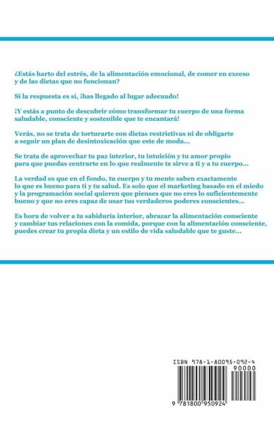 ¿Estás harto del estrés, de la alimentación emocional, de comer en exceso y de las dietas que no funcionan? Si la respuesta es sí, ¡has llegado al lugar adecuado! ¡Y estás a punto de descubrir cómo transformar tu cuerpo de una forma saludable, consciente y sostenible que te encantará! Verás, no se trata de torturarte con dietas restrictivas ni de obligarte a seguir un plan de desintoxicación que este de moda... Se trata de aprovechar tu paz interior, tu intuición y tu amor propio para que puedas centrarte en lo que realmente te sirve a ti y a tu cuerpo... La verdad es que en el fondo, tu cuerpo y tu mente saben exactamente lo que es bueno para ti y tu salud. Es solo que el marketing basado en el miedo y la programación social quieren que pienses que no eres lo suficientemente bueno y que no eres capaz de usar tus verdaderos poderes conscientes... Es hora de volver a tu sabiduría interior, abrazar la alimentación consciente y cambiar tus relaciones con la comida, porque con la alimentación consciente, puedes crear tu propia dieta y un estilo de vida saludable que te guste... Esto es exactamente lo que descubrirás en este libro: -Qué es exactamente el estado de consciencia plena y la alimentación consciente y cómo puedes aplicarlo hoy mismo para empezar a experimentar sus increíbles beneficios en tu mente y cuerpo. -Los mayores secretos de la pérdida de peso y la alimentación saludable (y por qué la mayoría de los "gurús" de las dietas no quieren que los conozcas). -¿Tiendes a comer en exceso o a ingerir alimentos poco saludables cuando estás estresado o triste? Descubre una forma mejor y aprende a hacer que tus emociones trabajen a tu favor, no en tu contra... -¿Estás demasiado ocupado para meditaciones complicadas y protocolos de superación personal? Descubre la forma más sencilla de practicar la alimentación consciente, sin importar dónde estés y lo ocupado que estés. -Cómo la práctica de la alimentación consciente puede potenciar todas las áreas de tu salud y tu vida, si aplicas este secreto. -Técnicas de relajación holística que puedes dominar rápidamente (y que te servirán para el resto de tu vida). -Consejos sencillos para convertir tus comidas en rituales inolvidables con unos simples trucos de atención plena (la mayoría de la gente se lo pierde). ¿Estás preparado para abrazar el poder de la atención plena, la vida sana y el amor propio para empezar un nuevo capítulo de tu vida, equilibrado y sin estrés? Regálate la libertad interior, la autoaceptación y la verdadera salud. Compra tu copia ahora mismo y libera el poder curativo de la alimentación consciente.