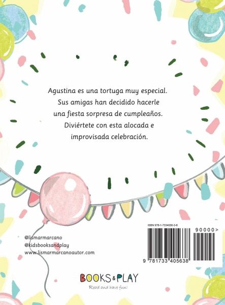 La Alocada sorpresa para Agustina, es escrito por la Venezolana Lismar Marcano. Es un cuento ilustrado muy divertido con 11 personajes. Agustina, es una tortuga y sus amigas deciden hacerle una fiesta de cumpleaños sorpresa, la cual se convierte en un alocada e improvisada celebración. En esta divertida historia los niños encontraran sucesos en cadena. Es un libro para trabajar en los niños la importancia de la amistad, la planificación y la improvisación en caso de ser necesario. Es un cuento, con hermosas ilustraciones a cargo de la Venezolana Vanessa Balleza. En este libro encontraras personajes como: Tortuga, Vaca, Coneja, Oveja, Puerco Espín, Pata, Pájaros, Cerdo, Gallina,que viven en una hermosa pradera. Es una lectura fresca para niños mayores de 4 años, primeros lectores. Ideal para trabajar en Teatro Infantil. The Crazy Surprise for Agustina, is written by the Venezuelan Lismar Marcano. It is a very funny illustrated story with 11 characters. Agustina is a turtle and her friends decide to throw her a surprise birthday party, which turns into a wild and improvised celebration. In this funny story the children will find chain events. It is a book for children to work on the importance of friendship, planning and improvisation if necessary. It is a story, with beautiful illustrations by the Venezuelan Vanessa Balleza. In this book you will find characters like: Turtle, Cow, Rabbit, Sheep, Porcupine, Paw, Birds, Pig, Hen, living in a beautiful meadow. It's a cool read for kids over 4 years old, first readers. Ideal for working in Children's Theater.2