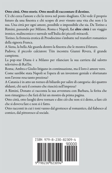 Otto città. Otto storie. Otto modi di raccontare il destino. C'è chi cerca l'amore e chi lo trova nel posto sbagliato. Chi vede il proprio futuro da una finestra e chi scopre di aver vissuto una vita che non è la sua. Una città per ogni amore, possibile o impossibile che sia. Da Torino a Rimini, passando per Milano, Roma e Napoli, Le altre città è un viaggio ironico, malinconico e surreale nell'Italia dei piccoli miracoli. Torino; la frenesia erotica di Prosdocimo s'imbatte nel transfert romantico della signora Franca. A Siena, la bella Ale guarda dentro la finestra che le mostra il futuro. Padova; il piccolo calciatore Tiin incontra Gianni Rivera, il grande campione. La pop-star Diana è a Milano per rilanciare la sua carriera dal salotto televisivo di RaiTre. Roma; Ambra e Giulio litigano in continuazione, ma il loro è amore vero. Come sarebbe stata Napoli se l'opera di un inventore geniale e sfortunato non l'avesse resa tanto preziosa? A Catania è in atto un torneo di biliardo per salire di categoria: dei quattro sfidanti, chi sarà il cornuto che riuscirà nell'impresa? A Rimini, Donato ci racconta la sua avventura con Barbara, la ferita che non rimargina e che farà di lui un mostro da prima pagina. Otto città, otto luoghi dove tornare e dire ciò che non si è detto, a fare ciò che si doveva fare e non si è fatto. Otto racconti in cui i toni vanno dal grottesco al romantico, dal fiabesco al comico, dal pittoresco al sociale.