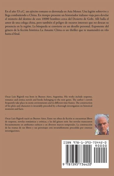 En el año 53 a.C. un ejército romano es derrotada en Asia Menor. Una legión sobrevive y llega combatiendo a China. En tiempo presente un historiador italiano viaja para develar el misterio del destino de esos 10000 hombres cerca del Desierto de Gobi. Allí halla el amor de una colega china, pero también el peligro de oscuros intereses que no desean su presencia en la región. La búsqueda se convierte en un desafío personal. Exponente del género de la ficción histórica La Amante China es un thriller que te mantendrá en vilo hasta el final.