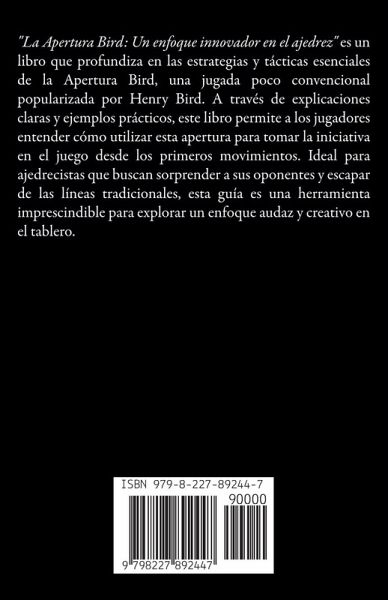 "La Apertura Bird: Un enfoque innovador en el ajedrez" es un libro que profundiza en las estrategias y tácticas esenciales de la Apertura Bird, una jugada poco convencional popularizada por Henry Bird. A través de explicaciones claras y ejemplos prácticos, este libro permite a los jugadores entender cómo utilizar esta apertura para tomar la iniciativa en el juego desde los primeros movimientos. Ideal para ajedrecistas que buscan sorprender a sus oponentes y escapar de las líneas tradicionales, esta guía es una herramienta imprescindible para explorar un enfoque audaz y creativo en el tablero.