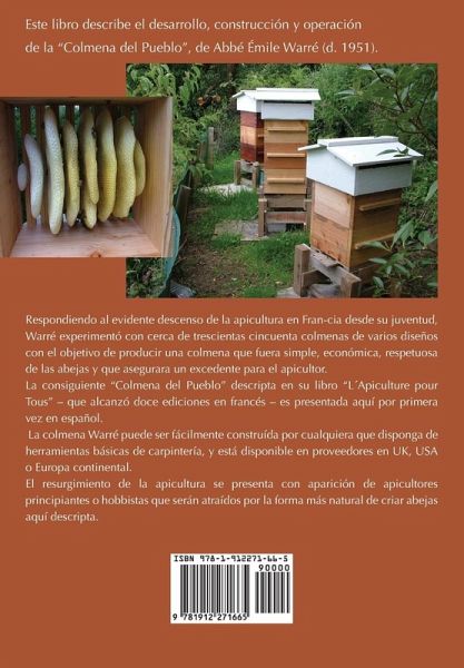 Este libro describe el desarrollo, construcción y operación de la "Colmena del Pueblo", de Abbé Émile Warré (d. 1951). Respondiendo al evidente descenso de la apicultura en Fran-cia desde su juventud, Warré experimentó con cerca de trescientas cincuenta colmenas de varios diseños con el objetivo de producir una colmena que fuera simple, económica, respetuosa de las abejas y que asegurara un excedente para el apicultor. La consiguiente "Colmena del Pueblo" descripta en su libro "L¿Apiculture pour Tous" - que alcanzó doce ediciones en francés - es presentada aquí por primera vez en español. La colmena Warré puede ser fácilmente construída por cualquiera que disponga de herramientas básicas de carpintería, y está disponible en proveedores en UK, USA o Europa continental. El resurgimiento de la apicultura se presenta con aparición de apicultores principiantes o hobbistas que serán atraídos por la forma más natural de criar abejas aquí descripta.