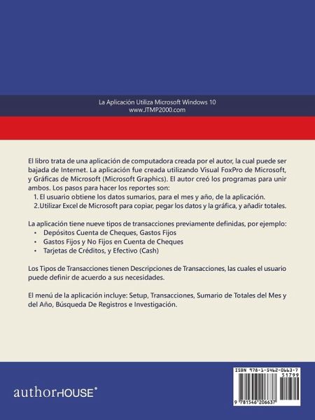 El libro trata de una aplicación de computadora creada por el autor, la cual puede ser bajada de Internet. La aplicación fue creada utilizando Visual FoxPro de Microsoft, y Gráficas de Microsoft (Microsoft Graphics). El autor creó los programas para unir ambos. Los pasos para hacer los reportes son: 1. El usuario obtiene los datos sumarios, para el mes y año, de la aplicación. 2. Utilizar Excel de Microsoft para copiar, pegar los datos y la gráfica, y añadir totales. La aplicación tiene nueve tipos de transacciones previamente definidas, por ejemplo: ¿ Depósitos Cuenta de Cheques, Gastos Fijos ¿ Gastos Fijos y No Fijos en Cuenta de Cheques ¿ Tarjetas de Créditos, y Efectivo (Cash) Los Tipos de Transacciones tienen Descripciones de Transacciones, las cuales el usuario puede definir de acuerdo a sus necesidades. El menú de la aplicación incluye: Setup, Transacciones, Sumario de Totales del Mes y del Año, Búsqueda De Registros e Investigación.
