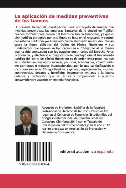 El presente trabajo de investigación tiene por objeto determinar qué medidas preventivas, las empresas Bancarias de la ciudad de Trujillo, pueden formular para prevenir el Delito de Pánico Financiero, ya que el bien jurídico protegido por esta figura se basa en el resguardo y control del sistema crediticio y/o financiero. Se ha efectuado un estudio intenso sobre la figura delictiva del Delito de Pánico Financiero y sus fundamentos que agravan su tipificación en el Código Penal, el mismo que ha sido comparado con los estudios doctrinarios del Derecho Penal Económico, y efectuado el diagnóstico se concluyó que el fundamento jurídico del delito de pánico financiero es de orden extra-penal, ya que se sustentan en conceptos sociales, políticos, económicos, coyunturales y/o corrientes o tratados internacionales; por lo que su tipificación e incorporación en el Código Penal va a generar, especialmente, muchas controversias, debates y beneficios importantes en aras a la buena defensa y protección que se les va a proporcionar a nuestros consumidores y usuarios en materia financiera.