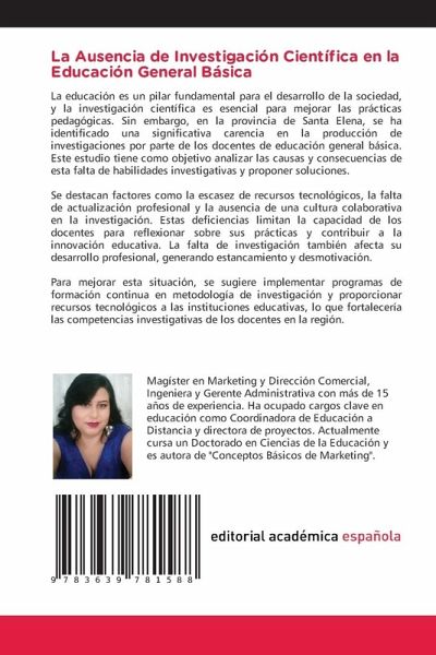 La educación es un pilar fundamental para el desarrollo de la sociedad, y la investigación científica es esencial para mejorar las prácticas pedagógicas. Sin embargo, en la provincia de Santa Elena, se ha identificado una significativa carencia en la producción de investigaciones por parte de los docentes de educación general básica. Este estudio tiene como objetivo analizar las causas y consecuencias de esta falta de habilidades investigativas y proponer soluciones.Se destacan factores como la escasez de recursos tecnológicos, la falta de actualización profesional y la ausencia de una cultura colaborativa en la investigación. Estas deficiencias limitan la capacidad de los docentes para reflexionar sobre sus prácticas y contribuir a la innovación educativa. La falta de investigación también afecta su desarrollo profesional, generando estancamiento y desmotivación.Para mejorar esta situación, se sugiere implementar programas de formación continua en metodología de investigación y proporcionar recursos tecnológicos a las instituciones educativas, lo que fortalecería las competencias investigativas de los docentes en la región.