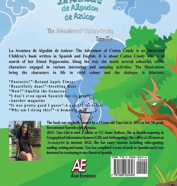 La Aventura de Algodón de Azúcar - The Adventure of Cotton Candy- is an illustrated Children's book written in Spanish and English. It is about Cotton Candy who is in search of her friend Peppermint. Along the way she meets several colourful, edible characters engaged in various interesting and amusing activities. The illustrations bring the characters to life in vivid colour and the dialogue is hilarious. "Fantastic!" - Rotund Apple Times "Beautifully done!" - Strolling Bone "Wow!" - Smellin the Generous "I don't even speak Spanish but it's great!" -Another magazine "It was pretty good I guess" -A guy off the street "Why am I doing this?" -A homeless man