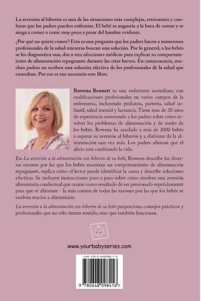 La aversión al biberón es una de las situaciones más complejas, estresantes y confusas que los padres pueden enfrentar. El bebé se angustia a la hora de comer y se niega a comer o come muy poco a pesar del hambre evidente. ¿Por qué no quiere comer? Esta es una pregunta que los padres hacen a numerosos profesionales de la salud mientras buscan una solución. Por lo general, a los bebés se les diagnostica una, dos o tres afecciones médicas para explicar su comportamiento de alimentación repugnante durante las citas breves. En consecuencia, muchos padres no reciben una solución efectiva de los profesionales de la salud que consultan. Por eso es tan necesario este libro. Rowena Bennett es una enfermera australiana con cualificaciones profesionales en varios campos de la enfermería, incluyendo pediatría, partería, salud infantil, salud mental y lactancia. Tiene más de 20 años de experiencia asesorando a los padres sobre cómo resolver los problemas de alimentación y de sueño de los bebés. Rowena ha ayudado a más de 2000 bebés a superar su aversión al biberón y a disfrutar de la alimentación una vez más. Los padres afirman que el alivio está cambiando la vida.