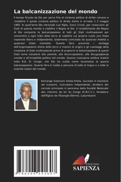 Il tempo fissato da Dio per porre fine al sistema politico di diritto romano e ristabilire il quinto sistema politico di diritto divino è arrivato il 3 maggio 1983. In quell'anno Dio intronizzò suo Figlio, Gesù Cristo, per rovesciare gli Stati di questo mondo e stabilire il Regno di Dio. Il ristabilimento del Regno di Dio comporta la balcanizzazione di tutti gli Stati multinazionali per consentire a ogni tribù della terra di stabilire sul proprio suolo uno Stato nazionale libero e indipendente, totalmente svincolato da qualsiasi fedeltà a qualsiasi Stato mondiale. Questo libro presenta i vantaggi dell'organizzazione divina della terra e mostra le origini e gli svantaggi della creazione di Stati multinazionali prima di proporre la balcanizzazione di questi Stati come soluzione alla povertà, alla disoccupazione, alla disuguaglianza sociale e all'instabilità politica nel mondo. Questa rivoluzione politica inizierà nella R.D. D. Congo, che Dio ha scelto come locomotiva di questa balcanizzazione. Questo libro è rivolto a persone di tutte le lingue e a tutte le autorità statali del mondo.