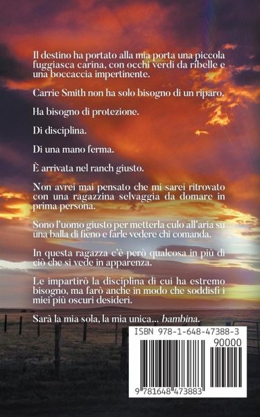 Il destino ha portato alla mia porta una piccola fuggiasca carina, con occhi verdi da ribelle e una boccaccia impertinente. Carrie Smith non ha solo bisogno di un riparo. Ha bisogno di protezione. Di disciplina. Di una mano ferma. È arrivata nel ranch giusto. Non avrei mai pensato che mi sarei ritrovato con una ragazzina selvaggia da domare in prima persona. Sono l'uomo giusto per metterla culo all'aria su una balla di fieno e farle vedere chi comanda. In questa ragazza c'è però qualcosa in più di ciò che si vede in apparenza. Le impartirò la disciplina di cui ha estremo bisogno, ma farò anche in modo che soddisfi i miei più oscuri desideri. Sarà la mia sola, la mia unica… bambina.