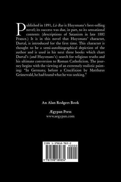 Published in 1891, La-bas is Huysmans' best-selling novel; its success was due, in part, to its sensational contents (descriptions of Satanism in late 1880 France.) It is in this novel that Huysmans' character, Durtal, is introduced for the first time. This character is thought to be a semi-autobiographical depiction of the author and is used in his next three books which chart Durtal's (and Huysmans') search for religious truths and his ultimate conversion to Roman Catholicism. The journey begins with the viewing of an extremely realistic painting: "In Germany, before a Crucifixion by Matthæus Grünewald, he had found what he was seeking."