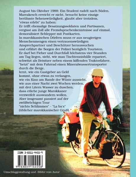August bis Oktober 1988: Ein Student radelt nach Süden. Marrakesch erreicht er nicht, besucht keine einzige berühmte Sehenswürdigkeit, glaubt aber trotzdem, "etwas erlebt" zu haben: Er trifft ehemalige Besatzungssoldaten und Partisanen, vergisst am Zoll alle Fremdsprachenkenntnisse auf einmal, demoralisiert Schlepper mit Postkarten. In marokkanischen Dörfern muss er aus neugierigen Menschenmengen einen vertrauenswürdigen Ansprechpartner heraussuchen, und erfährt die Sorgen der Polizei bezüglich Touristen. Er darf bei Fieber und Durchfall höchstens vier Stunden am Tag liegen, sieht, wie man Tischtennisbälle repariert, schwitzt als Beifahrer neben einem kiffenden Traktorfahrer, "hetzt" mit dem Fahrrad einen Mineralwassertransporter durch die Berge, lernt, wie ein Gastgeber an Geld kommt, ohne etwas zu verlangen, wie ein Kino am Rande der Wüste aussieht, wie aus einer Nacht zwei Wochen werden, mit drei Litern Wasser zu duschen, dass etliche junge Marokkaner verzweifelt auswandern wollen. Insgesamt passiert auf der zwölfwöchigen Tour "nichts Schlimmes" - "La ba's" (üblicher marokkanischer Gruß). Eine Reise aus Neugier ohne wirklichen Ehrgeiz. Ein Buch, das neugierig machen soll, und vor allem ein wenig unterhalten. Schwerpunkt ist nicht die Reise an sich, sondern die Begegnung mit den verschiedenen Menschen unterwegs. WARNUNG: Um Enttäuschungen vorzubeugen (aus gegebenem Anlass): Es ist kein Reiseführer und der Autor heisst nicht Hemingway !!!
