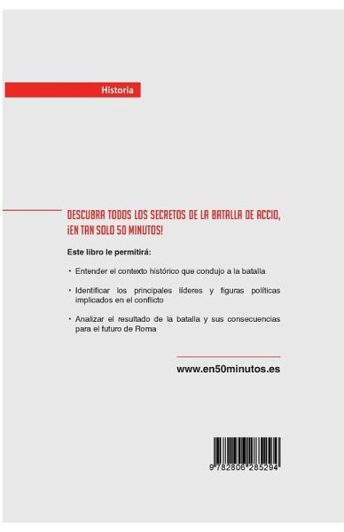 Este libro es una guía práctica y accesible para saber más sobre la batalla de Accio, que le aportará la información esencial y le permitirá ganar tiempo. En tan solo 50 minutos, usted podrá: ¿ Entender el contexto histórico que llevó a la batalla, con acontecimientos clave como el asesinato de Julio César ¿ Identificar los principales actores que participaron en el conflicto y la influencia que tuvieron sus decisiones y actos en el resultado de la batalla ¿ Analizar el resultado de la batalla y el impacto que la victoria de Octavio tuvo en el futuro de Roma y en su forma de gobierno SOBRE en50MINUTOS.ES Historia en50MINUTOS.ES le ofrece las claves para entender rápidamente los principales acontecimientos históricos que cambiaron el mundo. Nuestras obras narran de forma rápida y eficaz una gran variedad de acontecimientos históricos clave de distintas épocas, desde la Antigua Grecia hasta la caída del muro de Berlín. ¡Descubra en un tiempo récord la historia que ha marcado el rumbo del mundo!