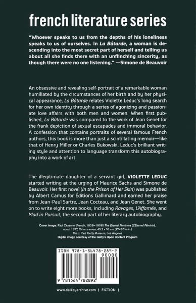 An obsessive and revealing self-portrait of a remarkable woman humiliated by the circumstances of her birth and by her physical appearance, La Batarde relates Violette Leduc's long search for her own identity through a series of agonizing and passionate love affairs with both men and women. When first published, La Batarde earned Violette Leduc comparisons to Jean Genet for the frank depiction of her sexual escapades and immoral behavior. A confession that contains portraits of several famous French authors, this book is more than just a scintillating memoir--like that of Henry Miller, Leduc's brilliant writing style and attention to language transform this autobiography into a work of art. First published in translation by Farrar, Straus and Giroux (1965), most recent paperback by Riverhead (1997).