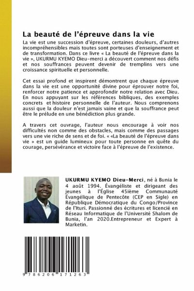 La vie est une succession d'épreuve, certaines douleurs, d'autres incompréhensibles mais toutes sont porteuses d'enseignement et de transformation. Dans ce livre « La beauté de l'épreuve dans la vie », UKURMU KYEMO Dieu-merci a découvert comment nos défis et nos souffrances peuvent devenir de tremplins vers une croissance spirituelle et personnelle.Cet essai profond et inspirent démontrent que chaque épreuve dans la vie est une opportunité divine pour éprouver notre foi, renforcer notre patience et approfondir notre relation avec Dieu. En nous appuyant sur les références bibliques, des exemples concrets et histoire personnelle de l'auteur. Nous comprenons aussi que la douleur n'est jamais vaine et que la souffrance peut être le prélude en une bénédiction plus grande.A travers cet ouvrage, l'auteur nous encourage à voir nos difficultés non comme des obstacles, mais comme des passages vers une vie riche de sens et de foi. « «La beauté de l'épreuve dans vie » est un guide lumineux pour toute personne en quête du courage, persévérance et victoire face à l'épreuve de l'existence.