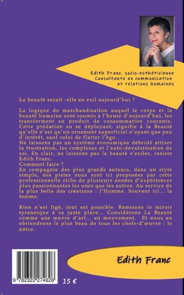 La beauté serait-elle en exil aujourd'hui ?La logique de marchandisation, auquel le corps et la beauté humaine sont soumis à l'heure d'aujourd'hui, les transforment en produit de consommation courante. Cette prédation en se déployant, signifie à la beauté qu'elle n'est qu'un ornement superficiel n'ayant que peu d'intérêt, sauf celui de flatter l'ego.Ne laissons pas un système économique débridé attiser la frustration, les complexes et l'auto-dévalorisation de soi. En clair, ne laissons pas la beauté s'exiler, insiste Edith Franc.Comment faire ?En compagnie des plus grands auteurs, dans un style simple, des pistes nous sont ici proposées par cette professionnelle riche de plusieurs années d'expériences plus passionnantes les unes que les autres. Au service de la plus belle des créations : l'Homme. Souvent ici... la femme.Rien n'est figé, tout est possible. Remisons le miroir tyrannique à sa juste place... Considérons La Beauté comme une oeuvre d'art... en mouvement. Et nous en obtiendrons le plus beau de tous les chefs-d'oeuvre : le nôtre.
