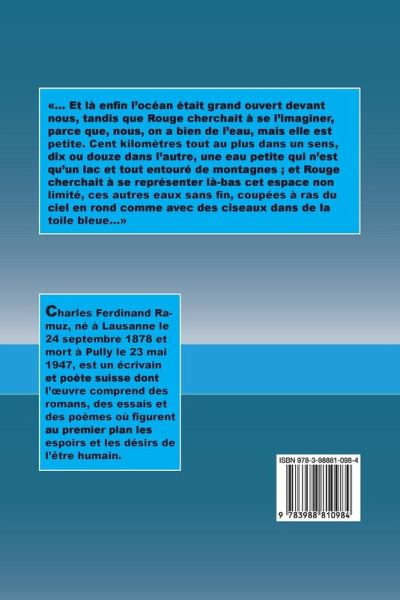 ... Et là enfin l'océan était grand ouvert devant nous, tandis que Rouge cherchait à se l'imaginer, parce que, nous, on a bien de l'eau, mais elle est petite. Cent kilomètres tout au plus dans un sens, dix ou douze dans l'autre, une eau petite qui n'est qu'un lac et tout entouré de montagnes ; et Rouge cherchait à se représenter là-bas cet espace non limité, ces autres eaux sans fin, coupées à ras du ciel en rond comme avec des ciseaux dans de la toile bleue...