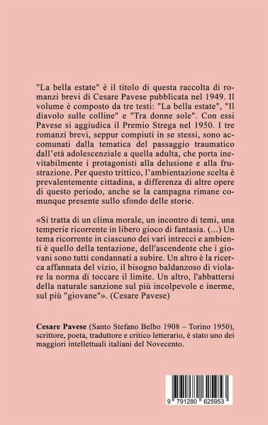 "La bella estate" è il titolo di questa raccolta di romanzi brevi di Cesare Pavese pubblicata nel 1949. Il volume è composto da tre testi: "La bella estate", "Il diavolo sulle colline" e "Tra donne sole". Con essi Pavese si aggiudica il Premio Strega nel 1950. I tre romanzi brevi, seppur compiuti in se stessi, sono accomunati dalla tematica del passaggio traumatico dall'età adolescenziale a quella adulta, che porta inevitabilmente i protagonisti alla delusione e alla frustrazione. L'ambientazione scelta per questo trittico è prevalentemente cittadina, a differenza di altre opere di questo periodo, anche se la campagna rimane comunque presente sullo sfondo delle storie.Si tratta di un clima morale, un incontro di temi, una temperie ricorrente in libero gioco di fantasia. Un tema ricorrente in ciascuno dei vari intrecci e ambienti è quello della tentazione, dell'ascendente che i giovani sono tutti condannati a subire. Un altro è la ricerca affannata del vizio, il bisogno baldanzoso di violare la norma di toccare il limite. Un altro, l'abbattersi della naturale sanzione sul più incolpevole e inerme, sul più "giovane". (Cesare Pavese)