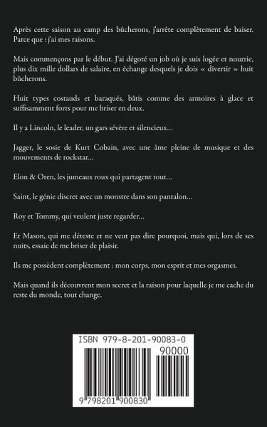 Après cette saison au camp des bûcherons, j'arrête complètement de baiser. Parce que : j'ai mes raisons. Mais commençons par le début. J'ai dégoté un job où je suis logée et nourrie, plus dix mille dollars de salaire, en échange desquels je dois divertir huit bûcherons. Huit types costauds et baraqués, bâtis comme des armoires à glace et suffisamment forts pour me briser en deux. Il y a Lincoln, le leader, un gars sévère et silencieux... Jagger, le sosie de Kurt Cobain, avec une âme pleine de musique et des mouvements de rockstar... Elon & Oren, les jumeaux roux qui partagent tout... Saint, le génie discret avec un monstre dans son pantalon... Roy et Tommy, qui veulent juste regarder... Et Mason, qui me déteste et ne veut pas dire pourquoi, mais qui, lors de ses nuits, essaie de me briser de plaisir. Ils me possèdent complètement : mon corps, mon esprit et mes orgasmes. Mais quand ils découvrent mon secret et la raison pour laquelle je me cache du reste du monde, tout change.