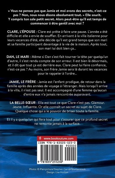 J'étais tout simplement bouche bée au moment où j'ai malheureusement terminé ce fantastique roman. J'ai commencé à le lire le vendredi soir et je n'ai pas pu m'en détacher jusqu'au petit matin. J'ai été captivée du début à la fin. Un membre de Goodreads, ¿¿¿¿¿ Vous ne pensez pas que Jamie et moi avons des secrets, n'est-ce pas ? Non, nous nous disons absolument tout. Elle sourit. Y compris ton sale petit secret. Alors peut-être qu'il est temps de commencer à être gentil avec moi ? CLARE, L'ÉPOUSE : Clare est prête à faire une pause. L'année a été difficile et elle a envie de souffler. En arrivant à la villa italienne pour leurs vacances d'été, elle décide qu'il est grand temps que son mari et sa famille participent davantage à la vie de la maison. Après tout, son mari lui doit bien ça... DAN, LE MARI : Même si Dan s'est fait tourner la tête par quelqu'un d'autre, il s'est rendu compte de son erreur. Il est bien là désormais, et il dit que tout ça est derrière eux. Clare peut lui faire confiance, n'est-ce pas ? Au moins, son frère Jamie sera là durant les vacances pour le rappeler à l'ordre... JAMIE, LE FRÈRE : Jamie est l'enfant prodigue, de retour dans la famille après des années de voyage à l'étranger. Mais lorsqu'il arrive à la villa, il n'est pas seul. Il est accompagné d'une femme qu'aucun d'entre eux n'a jamais rencontrée auparavant. LA BELLE-SUR : Ella est tout ce que Clare n'est pas. Glamour. Jeune. Influente. Or elle connaît un secret au sujet de Clare. Quelque chose qui a le pouvoir de briser toute la famille. Et il y a quelqu'un qui fera tout pour s'assurer que ce profond secret ne remonte jamais à la surface. Un thriller psychologique captivant et addictif qui vous trottera longtemps dans la tête. Les lecteurs adorent La Belle-sur : Wow wow wow wow... Je n'ai pas pu le lâcher ! Un livre captivant, j'étais au bord du malaise... Ma pression sanguine n'a pas cessé de monter tout au long de l'histoire ! Un membre de Goodreads, ¿¿¿¿¿ Je donne à ce livre 5 étoiles, sans hésiter ! Quel thriller fantastiquement écrit ! Je n'ai pas pu lâcher ce livre... La vache ! Juste au moment où je pensais savoir ce qui allait se passer, TOUT A BASCULÉ ! Je recommande vivement cette lecture palpitante au rythme rapide. Vous ne serez pas déçu ! Un membre de Goodreads, ¿¿¿¿¿ Une histoire qui vous fera frissonner... J'étais littéralement sur des charbons ardents... Électrifiant. J'avais du mal à me contrôler tant j'étais désespérée de découvrir les secrets cachés... Un page-turner captivant : impossible d'en suspendre la lecture ! C'est totalement addictif. Un membre de Goodreads, ¿¿¿¿¿ Ce livre était exactement ce dont j'avais besoin en cette période de stress... C'était l'escapade la plus incroyable sur la côte amalfitaine... Je n'ai pas pu l'arrêter... Vous devez le lire pour le croire ! Un membre de Goodreads, ¿¿¿¿¿ Quel livre !... Une véritable bombe - vous saviez que tout allait exploser, mais vous ne saviez jamais quand ! Robin Loves Reading, ¿¿¿¿¿