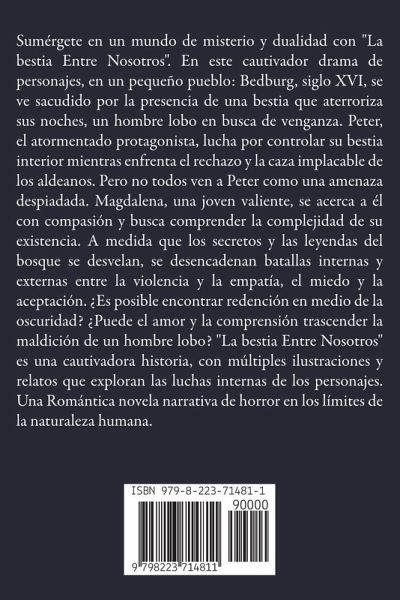 Sumérgete en un mundo de misterio y dualidad con "La bestia Entre Nosotros". En este cautivador drama de personajes, en un pequeño pueblo: Bedburg, siglo XVI, se ve sacudido por la presencia de una bestia que aterroriza sus noches, un hombre lobo en busca de venganza. Peter, el atormentado protagonista, lucha por controlar su bestia interior mientras enfrenta el rechazo y la caza implacable de los aldeanos. Pero no todos ven a Peter como una amenaza despiadada. Magdalena, una joven valiente, se acerca a él con compasión y busca comprender la complejidad de su existencia. A medida que los secretos y las leyendas del bosque se desvelan, se desencadenan batallas internas y externas entre la violencia y la empatía, el miedo y la aceptación. ¿Es posible encontrar redención en medio de la oscuridad? ¿Puede el amor y la comprensión trascender la maldición de un hombre lobo? "La bestia Entre Nosotros" es una cautivadora historia, con múltiples ilustraciones y relatos que exploran las luchas internas de los personajes. Una Romántica novela narrativa de horror en los límites de la naturaleza humana.