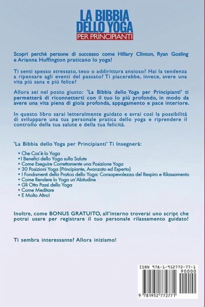 Scopri perché persone di successo come Ryan Gosling e Arianna Huffington praticano lo yoga! Ottieni l'accesso a 30 posizioni yoga con istruzioni step-by-step per sviluppare la tua pratica yoga personale. BONUS: All'Interno, Rilassamento Guidato Gratis! Ti senti spesso stressato, teso o addirittura ansioso? Hai la tendenza a ripensare agli eventi del passato? Ti piacerebbe, invece, avere una vita più sana e più felice? Allora sei nel posto giusto:'La Bibbia dello Yoga per Principianti' ti permetterà di riconnetterti con il tuo Io più profondo, in modo da avere una vita piena di gioia profonda, appagamento e pace interiore. La quantità di americani che praticano regolarmente lo yoga è aumentata da 20,4 milioni nel 2012 alla sbalorditiva cifra di 36 milioni nel 2016! Non possono sbagliarsi tutti. Viviamo in un mondo frenetico nel quale i nostri sensi vengono costantemente stimolati. Tuttavia, questo progresso ha un prezzo. Siamo costantemente tentati dal mantenerci in contatto con tutti e molte persone hanno perso il legame tra la loro mente e il loro corpo. Ti suona familiare? Lo yoga ti può aiutare a ristabilire questo equilibrio. Ad esempio, uno studio ha dimostrato che lo yoga - anche quando viene praticato per la primissima volta! - riesce a normalizzare i livelli dell'ormone dello stress, il cortisolo. In questo libro sarai letteralmente guidato e avrai così la possibilità di sviluppare una tua personale pratica dello yoga e riprendere il controllo della tua salute e della tua felicità. 'La Bibbia dello Yoga per Principianti' Ti Insegnerà: - Che Cos'è lo Yoga - I Benefici dello Yoga sulla Salute - Come Eseguire Correttamente una Posizione Yoga - 30 Posizioni Yoga (Principiante, Avanzato ed Esperto) - I Fondamenti della Pratica dello Yoga: Consapevolezza del Respiro e Rilassamento - Come Rendere lo Yoga un'Abitudine - Gli Otto Passi dello Yoga - Come Meditare - E Molto Altro! Inoltre, come BONUS GRATUITO, all'interno troverai uno script che potrai usare per registrare il tuo personale rilassamento guidato! Ti sembra interessante? Allora iniziamo! Oggi è il giorno in cui puoi fare il primo passo per cambiare la tua vita tramite lo yoga. Quindi... SEI PRONTO AD AGIRE? ==>AGISCI ORA! Scorri verso l'alto e clicca sul pulsante 'compra' per ottenere la tua copia oggi stesso!