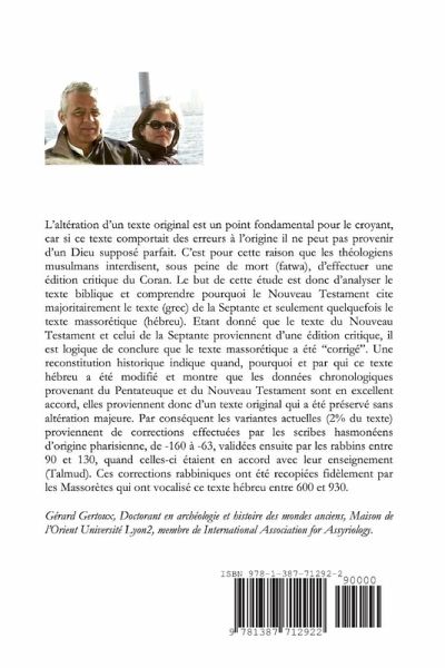 LÕalt¿ration dÕun texte original est un point fondamental pour le croyant, car si ce texte comportait des erreurs ¿ lÕorigine il ne peut pas provenir dÕun Dieu suppos¿ parfait. Le but de cette ¿tude est d'¿tablir une reconstitution historique pour savoir quand, pourquoi et par qui le texte h¿breu a ¿t¿ modifi¿ et de constater que les donn¿es chronologiques provenant du Pentateuque et du Nouveau Testament sont en excellent accord. Elles proviennent donc dÕun texte original qui a ¿t¿ pr¿serv¿ sans alt¿ration majeure. Par cons¿quent les variantes actuelles (2% du texte) proviennent de corrections effectües par les scribes hasmon¿ens dÕorigine pharisienne, de -160 ¿ -63, valid¿es ensuite par les rabbins entre 90 et 130, quand celles-ci ¿taient en accord avec leur enseignement (Talmud). Ces corrections rabbiniques ont ensuite ¿t¿ recopi¿es fid?lement par les Massor?tes qui ont vocalis¿ ce texte h¿breu entre 600 et 930.