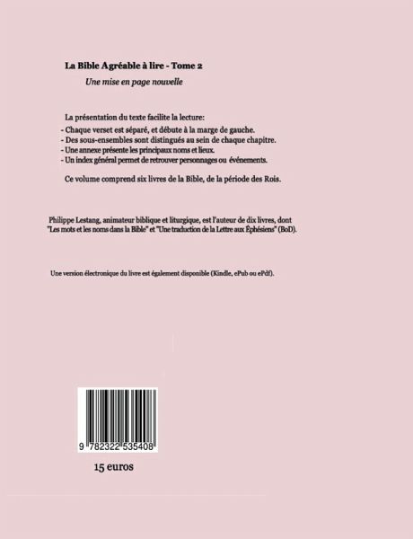 La Bible Agréable à lire - Tome 2 Une mise en page nouvelle. La présentation du texte facilite la lecture: - Chaque verset est séparé, et débute à la marge de gauche. - Des sous-ensembles sont distingués au sein de chaque chapitre. - Une annexe présente les principaux noms et lieux. - Un index général permet de retrouver personnages ou événements. Ce volume comprend six livres de la Bible, de la période des Rois.