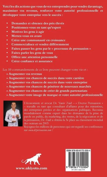 Voici les dix actions que vous devez entreprendre pour vendre davantage, maximiser vos revenus, renforcer votre autorité professionnelle et développer votre entreprise vers le succès : ¿ Demandez et obtenez des prix élevés ¿ Positionnez-vous en tant qu'expert ¿ Motivez les gens à agir ¿ Mettez-vous en avant ¿ Créez une communauté en croissance ¿ Commercialisez et vendez différemment ¿ Faites passer les gens par le processus de persuasion ¿ Faites parler les gens de vous ¿ Offrez une attention personnelle ¿ Créez confiance et assurance Les 10 commandements de ce livre peuvent changer votre vie et : Augmenter vos revenus Augmenter vos chances de succès dans votre carrière Augmenter vos chances de succès dans votre entreprise Augmenter vos chances de pénétrer de nouveaux marchés Augmenter vos chances de créer de grands partenariats Augmenter votre image de marque et votre autorité professionnelle
